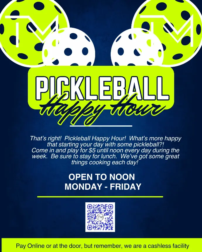 What better way to start your day than with some pickleball! Grab your partner or your foursome, join us every morning from open - noon for $5 pickleball.